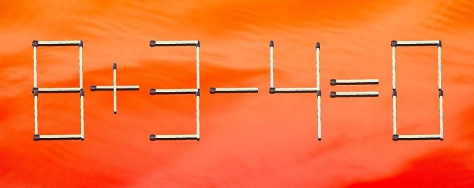 Di depan Anda ada contoh 8+3-4=0=0, yang jelas-jelas salah. Anda hanya dapat memindahkan satu korek api untuk memb soal tersebut masuk akal. Menurut aturan teka-teki tersebut, Anda tidak dapat menghapus tongkat dari tanda “=” atau mencoretnya, tetapi Anda diizinkan untuk mengubah simbol dan angka lainnya.